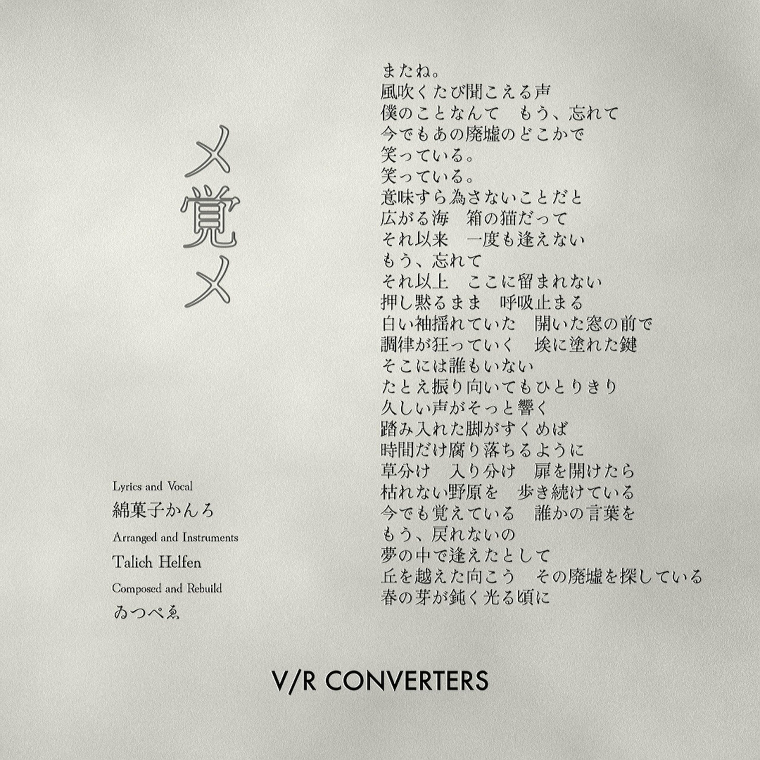 唯一無二の音楽制作を続けるV/R Convertersが、ボーカルにVsingerとしても活動する綿菓子かんろを迎えた新体制になり、12月にリリースするアルバム収録曲を連続リリースで継続中。第六弾の「メ覚メ」は、「二度と逢えなかったはずの人に再開する」をテーマにした楽曲となっております。