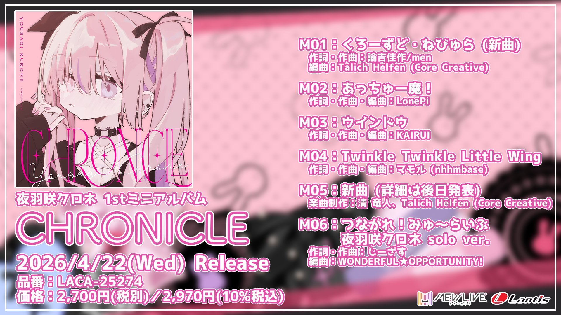 夜羽咲クロネ 1stミニアルバム 『CHRONICLE』 2026年4月22日(水)リリース決定! リード曲『くろーずど・ねびゅら』ともう1曲の新曲の編曲を Talich Helfen が、ギター演奏をゐつペゑ担当しました!